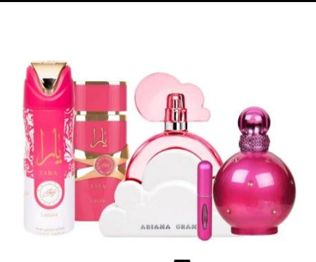 Este conjunto de fragancias femeninas importadas incluye Body Spray Yara (oriental dulce), Lattafa Yara Candy (gourmand frutal), Ariana Grande Cloud Pink (floral almizclado) y Elizabeth Arden Fantasy Britney Spears (gourmand frutal).
