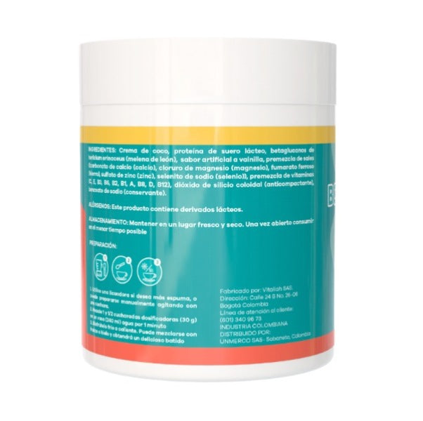 Alimento en polvo a base de crema de coco, adicionado con vitaminas y minerales, con betaglucanos de Hericium erinaceus (Melena de León).