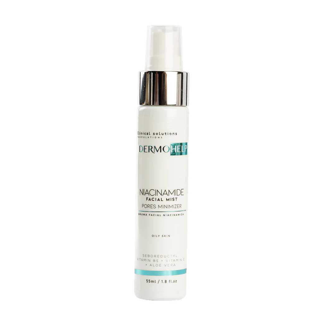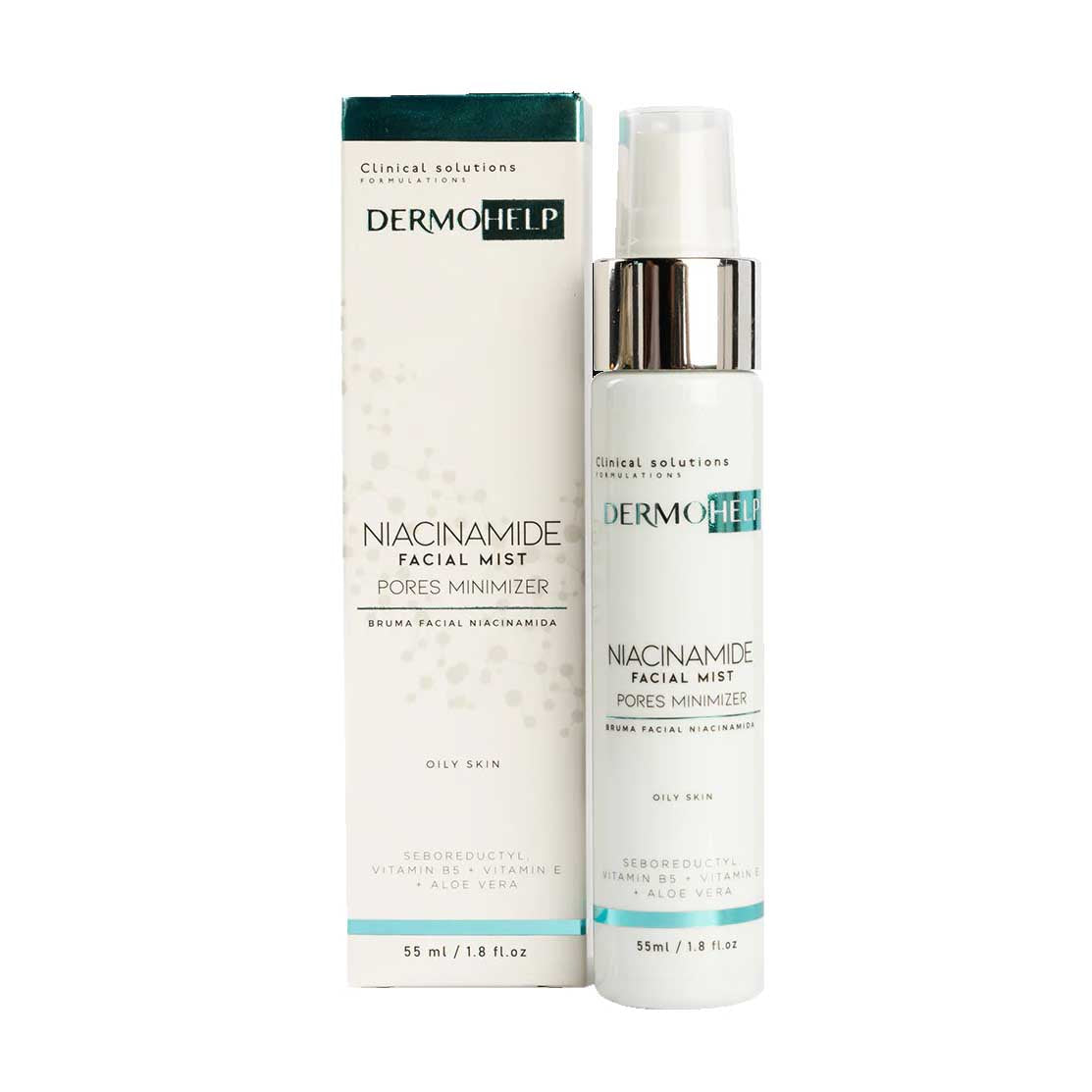 Nuestra Bruma DERMOHELP facial seborreguladora, funciona como un complemento y acompañante ideal del suero de NIACINAMIDA, ya que cumple exactamente con los beneficios de la disminución de grasa, proporcionando la reducción del tamaño de los poros, e igualando el tono de piel.