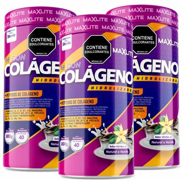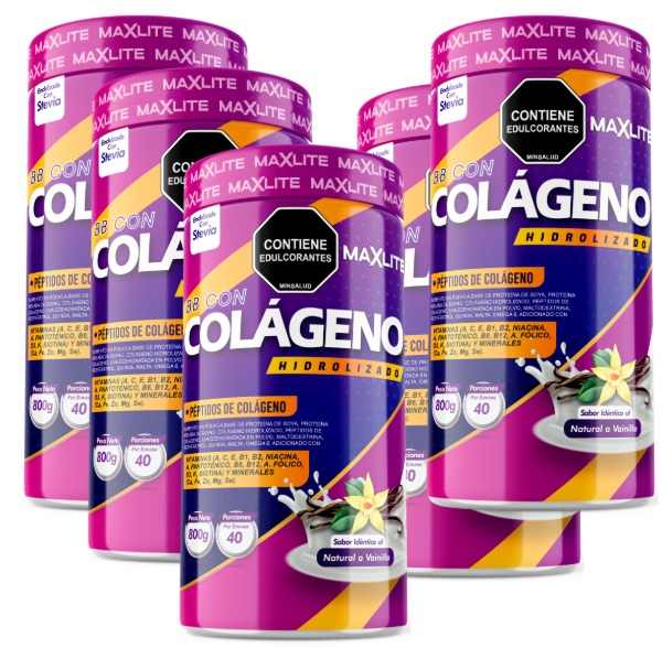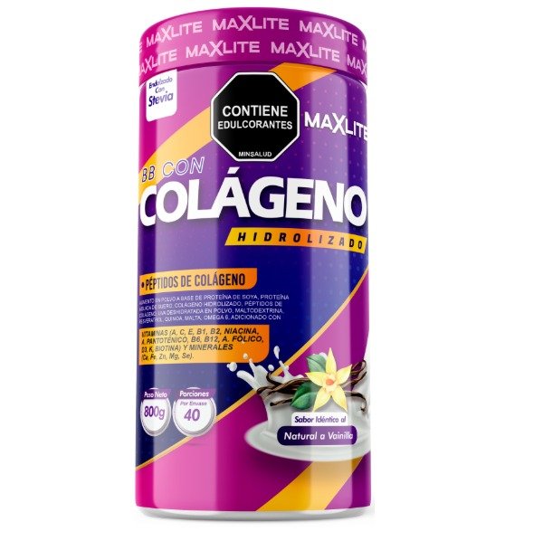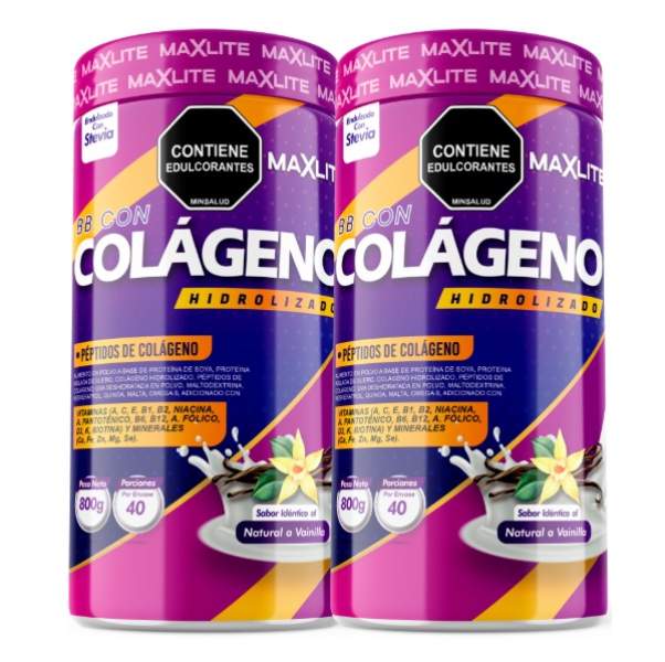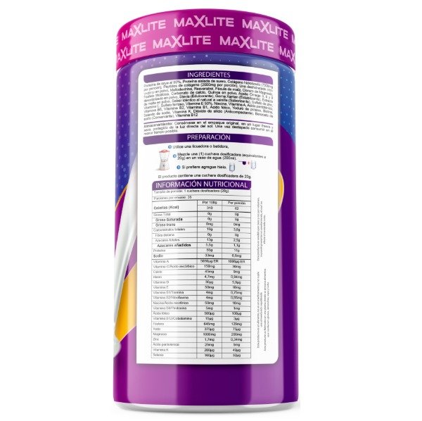 MaxLite es un alimento en polvo a base de proteína de soya y suero, enriquecido con colágeno hidrolizado, péptidos de colágeno, resveratrol, omega 3-6-9, quinua, uva deshidratada, vitaminas y minerales esenciales.