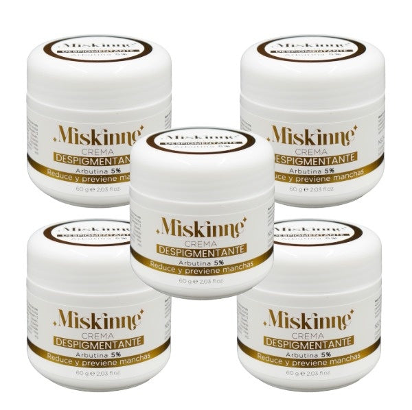 MISKINNE es una crema despigmentante corporal avanzada, formulada con Arbutina, un activo reconocido por su capacidad para inhibir la producción de melanina y aclarar manchas oscuras causadas por el sol, la edad, el melasma o cicatrices.