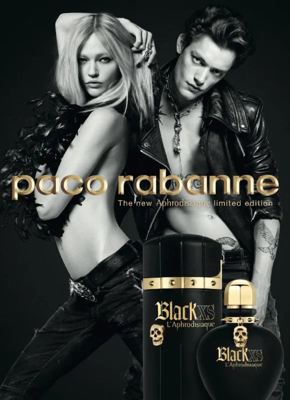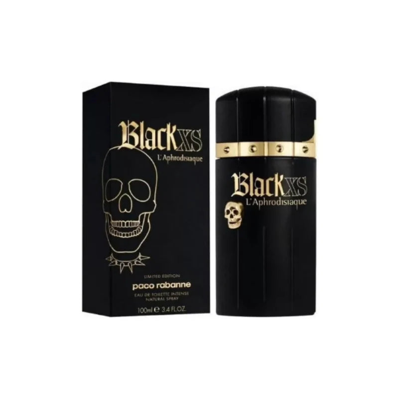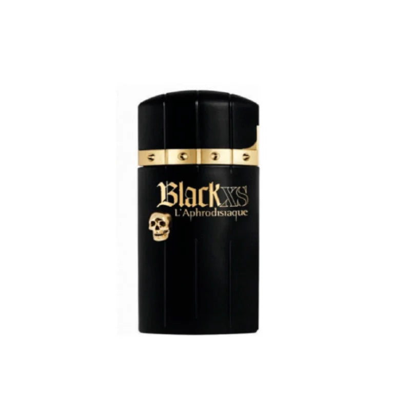 El frasco de Black XS L’Aphrodisi sigue la estética audaz y rebelde de la línea Black XS, con un diseño negro intenso y detalles cromados, reflejando la esencia poderosa y seductora de la fragancia.
