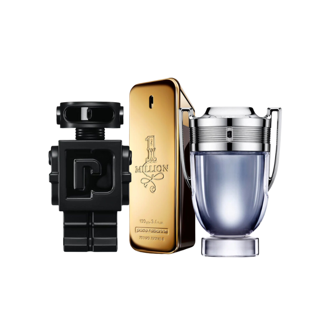 Este combo une tres íconos modernos de la perfumería masculina en una sola propuesta cargada de energía, seducción y personalidad. Diseñado para el hombre actual: seguro, atrevido y con un estilo inolvidable.