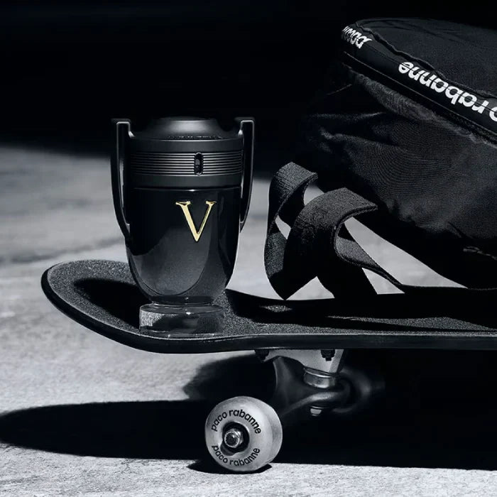 El mítico frasco Invictus se viste por primera vez con un ropaje negro brillante. Su tapón también enarbola este nuevo color: un negro mate profundo que genera un contraste contundente. Una intensidad insólita que encuentra su máxima expresión en la imponente V dorada central.